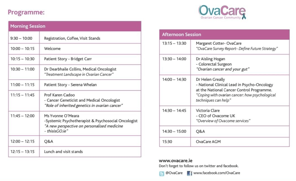 The programme for Ovacare Patient day this coming Sat Nov 19th in #thedeanhotelGalway.