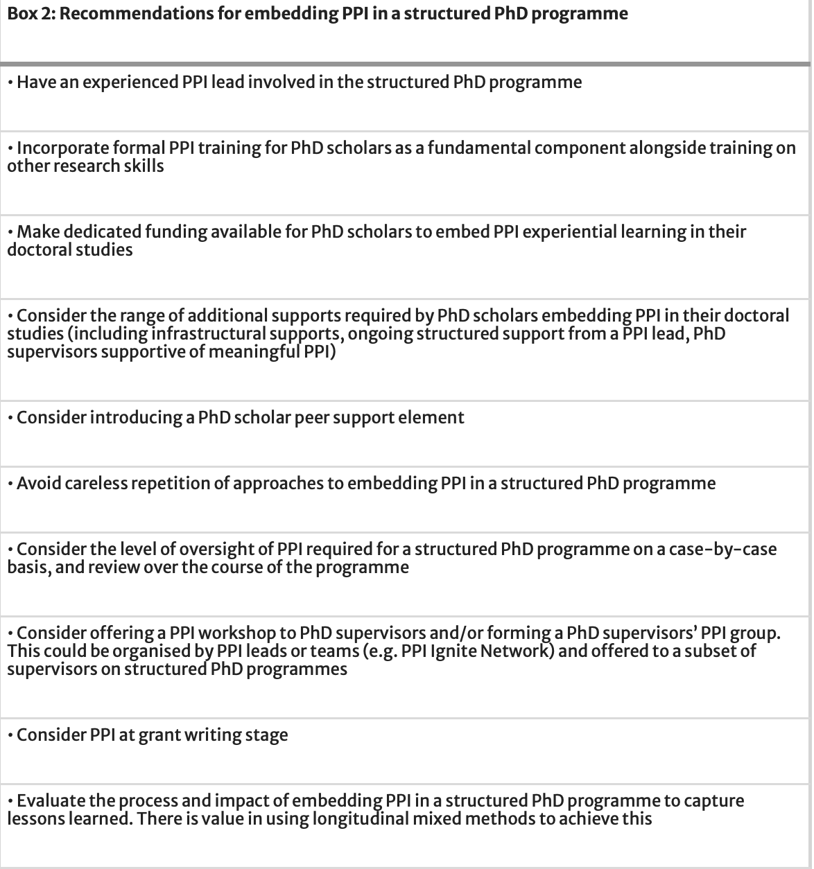 Embedding formal and experiential PPI training in a structured PhD programme is a novel approach. The evaluation has identified a number of lessons that can inform future doctoral programmes seeking to embed formal and experiential PPI training.