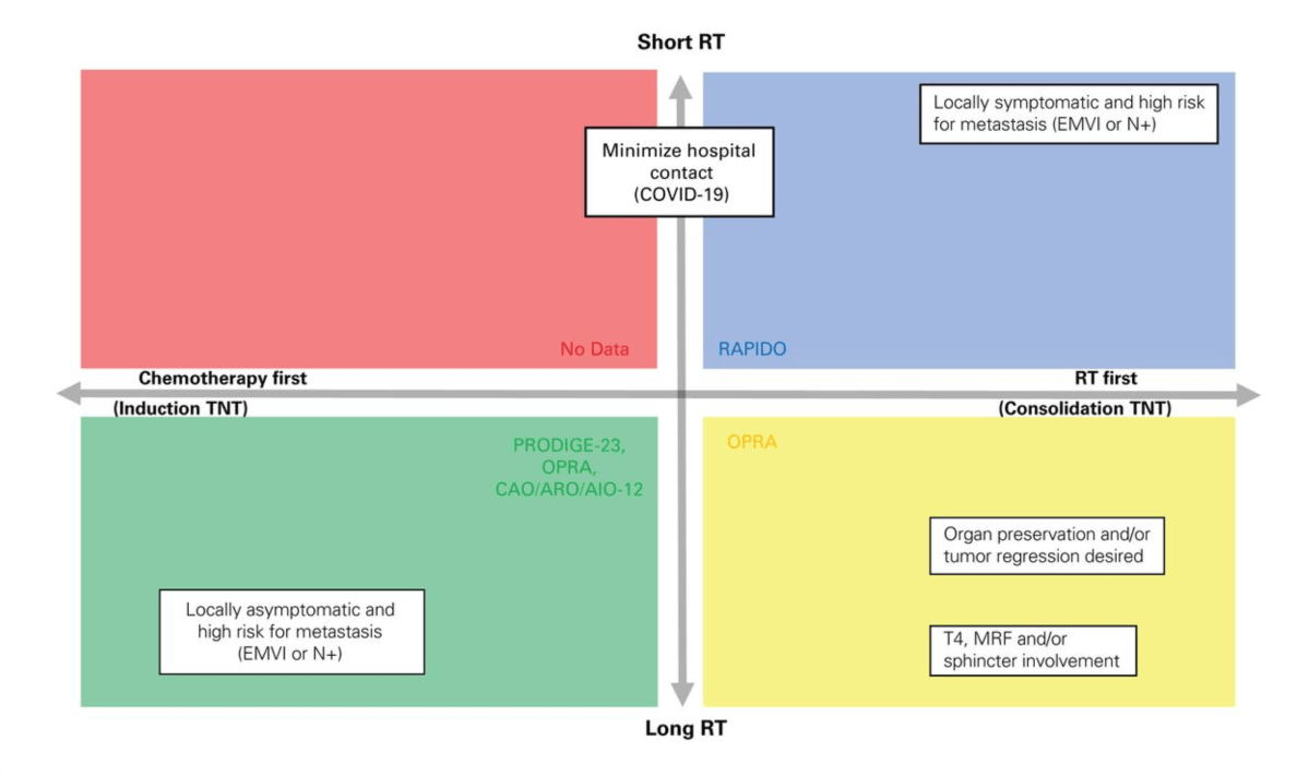 With the release of data from new landmark randomized controlled trials (RAPIDO, PRODIGE-23), total neoadjuvant therapy (TNT) has moved to the forefront of locally advanced rectal cancer treatment and is considered a standard option in selected patients.