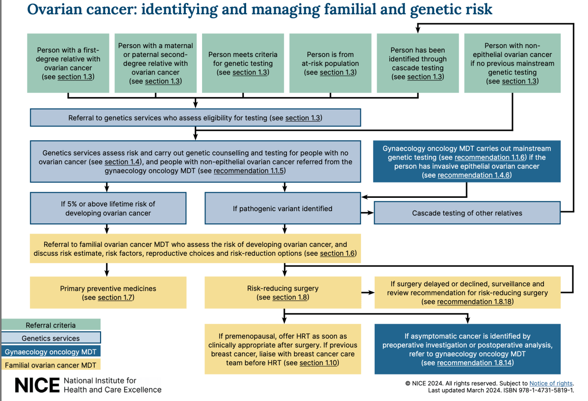 - Refer for genetic counselling and testing people who have a first or second degree relative diagnosed with ovarian cancer, those from high risk groups, anyone identified through cascade testing, or those diagnosed with ovarian cancer linked to pathogenic variants