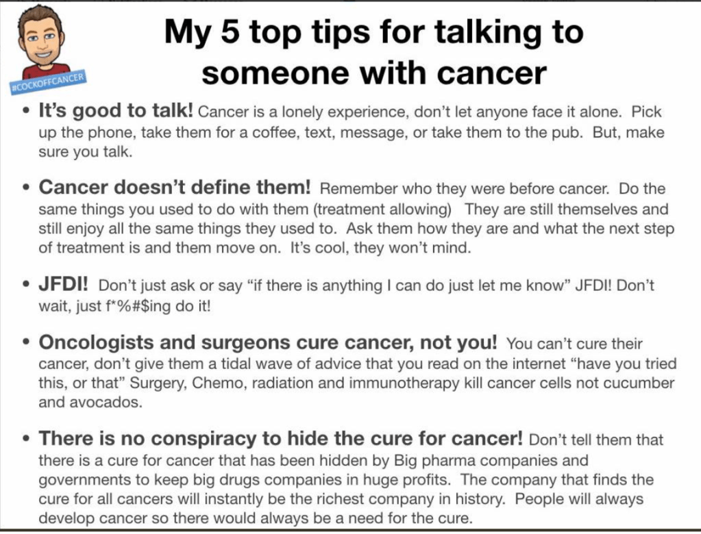Tips for talking to someone with Cancer Share this: Click to share on Facebook (Opens in new window) Facebook Click to share on X (Opens in new window) X Click to email a link to a friend (Opens in new window) Email More Click to print (Opens in new window) Print Like Loading... Related
