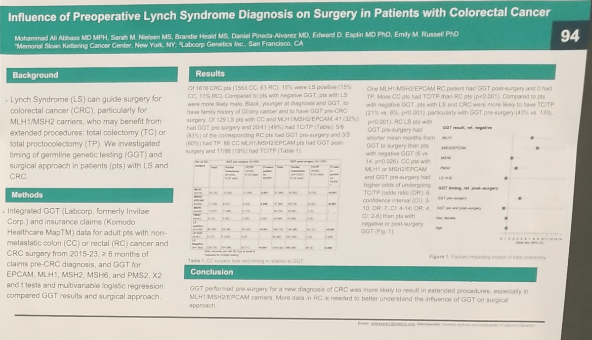 Lynch Syndrome (LS) can guide surgery for colorectal cancer (CRC), particularly for MLH1/MSH2 carriers, who may benefit from extended procedures: total colectomy (TC) or total proctocolectomy (TP).Investigated timing of germline genetic testing (GGT) and surgical approach in patients (pts) with LS and CRC.