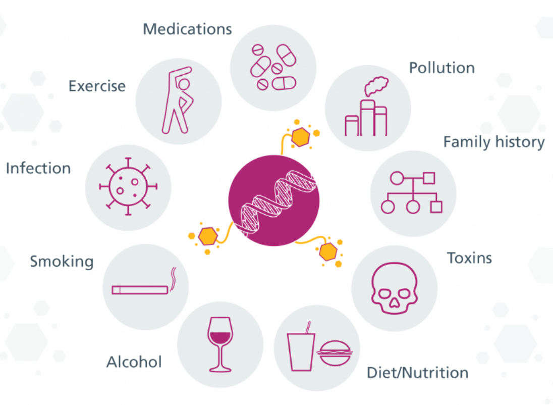 Epigenetics: Is a way of influencing how our genome is regulated without the DNA code itself being changed. Epigenetics can determine when genes are turned on and off (also referred to as gene expression), and which proteins are produced as a result. It can even control the structure of the genome, relaxing the tightly packed chromosomes to allow the factors which control gene expression access to the genes within.