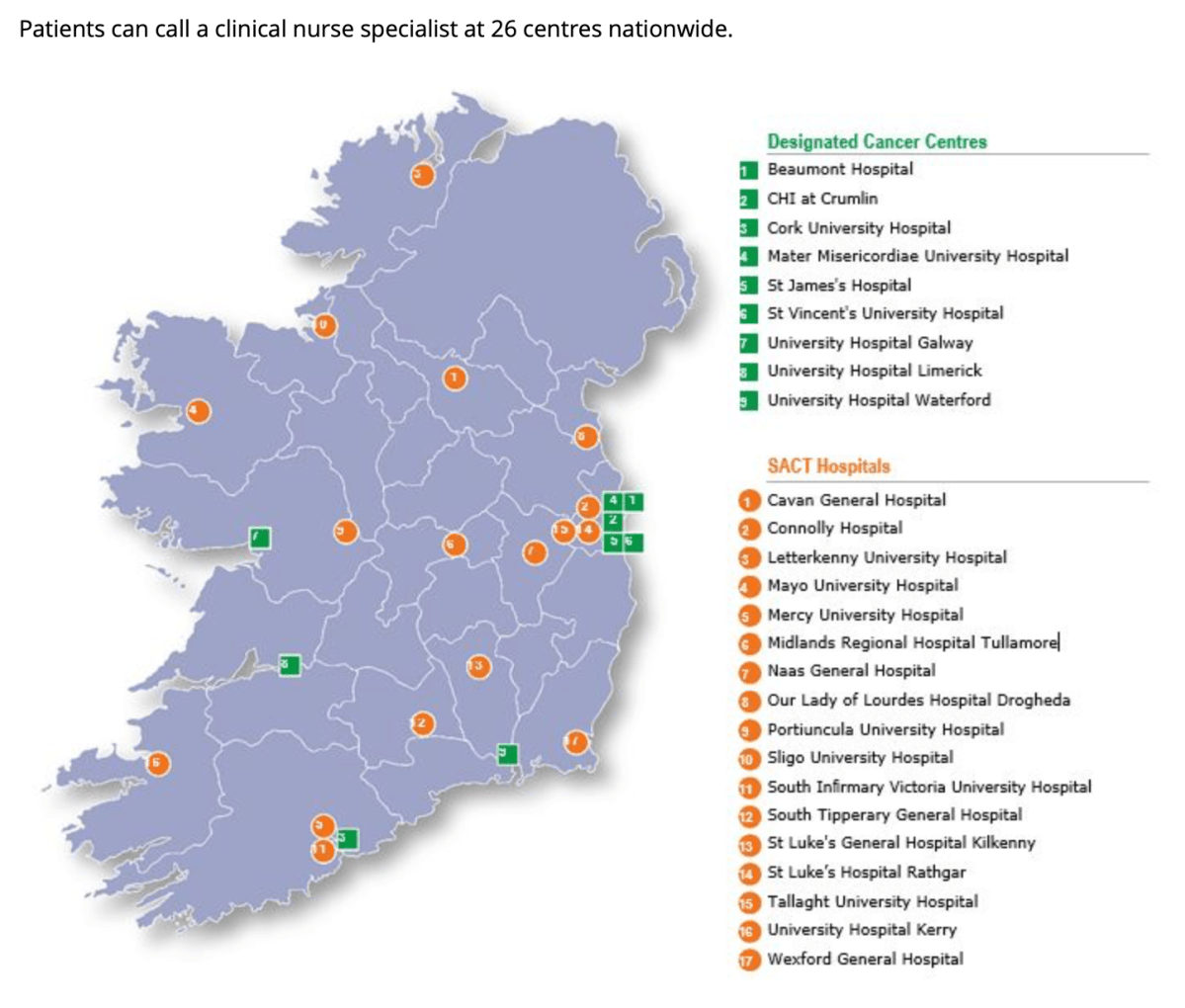 Patients can call a dedicated phone line to speak with a clinical nurse specialist at one of 26 centres across the country that offer cancer treatment. This service helps schedule immediate care for patients who need attention during their active treatment.