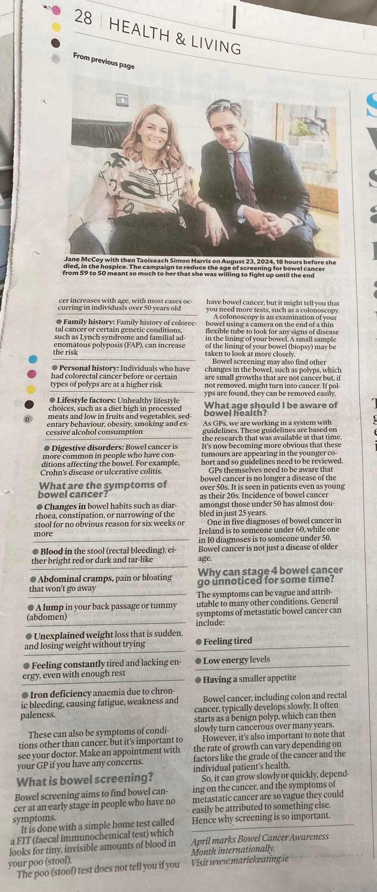 Bowel Cancer: the facts Dr Fiona Macken: Irish Independent – Health & Living Are there particular risk factors for Bowel Cancer? Share this: Click to share on Facebook (Opens in new window) Facebook Click to share on X (Opens in new window) X Click to email a link to a friend (Opens in new window) Email More Click to print (Opens in new window) Print Like Loading... Related