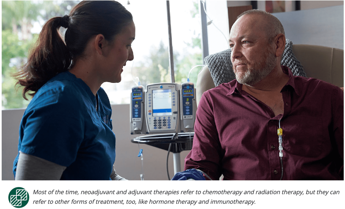 Adjuvant and neoadjuvant therapies are treatments delivered before or after the primary treatment—in most cases, surgery—to help increase its chance of success and decrease the risk of cancer recurrence.